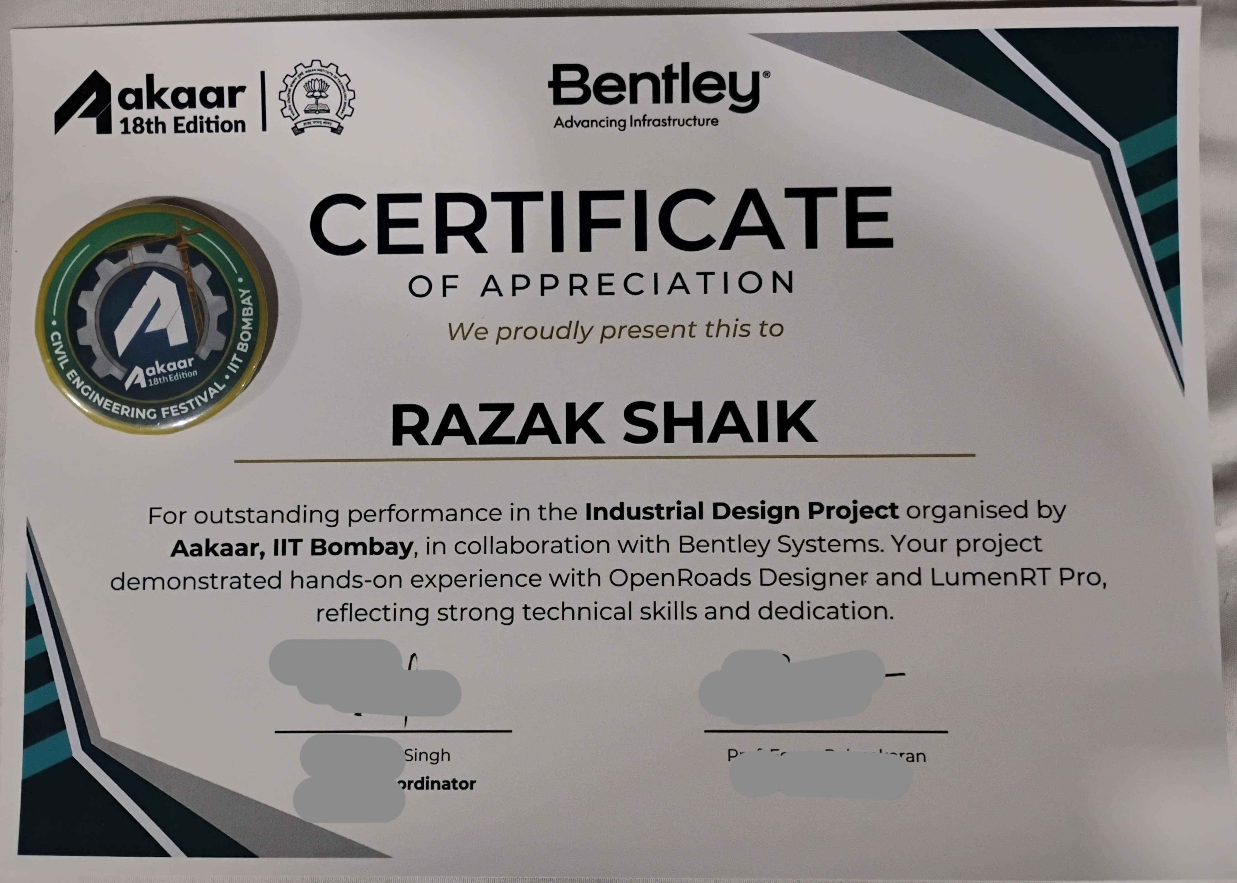 Recevied Certificate of appreciation - Secured in Top Finalist Team in IDP (Open Road Designer & LumenRT Pro) Bently x Aakaar IIT Bombay